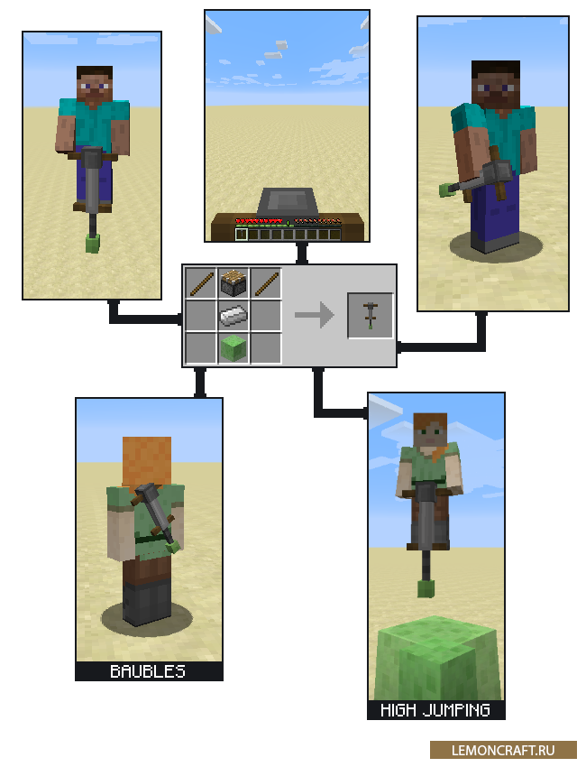 Мод на тренажер пого-стик Pogo Sticks добавит в игру устройств с помощью которого вы сможете прыгать. С данным устройством перемещение по миру майнкрафт станет намного веселее и в то же время намного быстрее, чем пешком. На нем вы сможете довольно высоко подпрыгивать, что позволит забраться на какие то небольшие возвышенности.